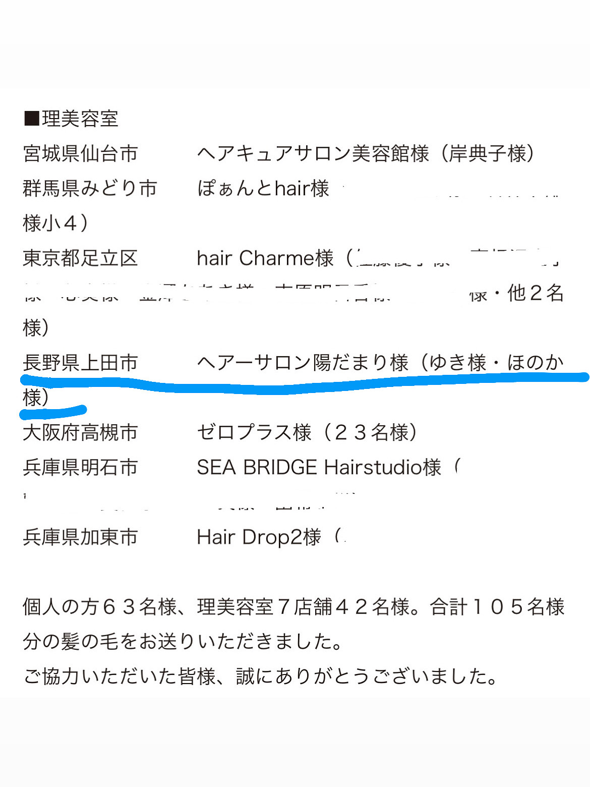 【2025年9月】ヘアドネーションして頂いたお客様ありがとうございました